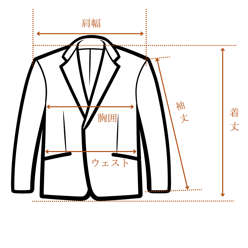 ウエスト:ジャケットの一番くびれている部分を直線で測り、その長さを2倍した数値です。