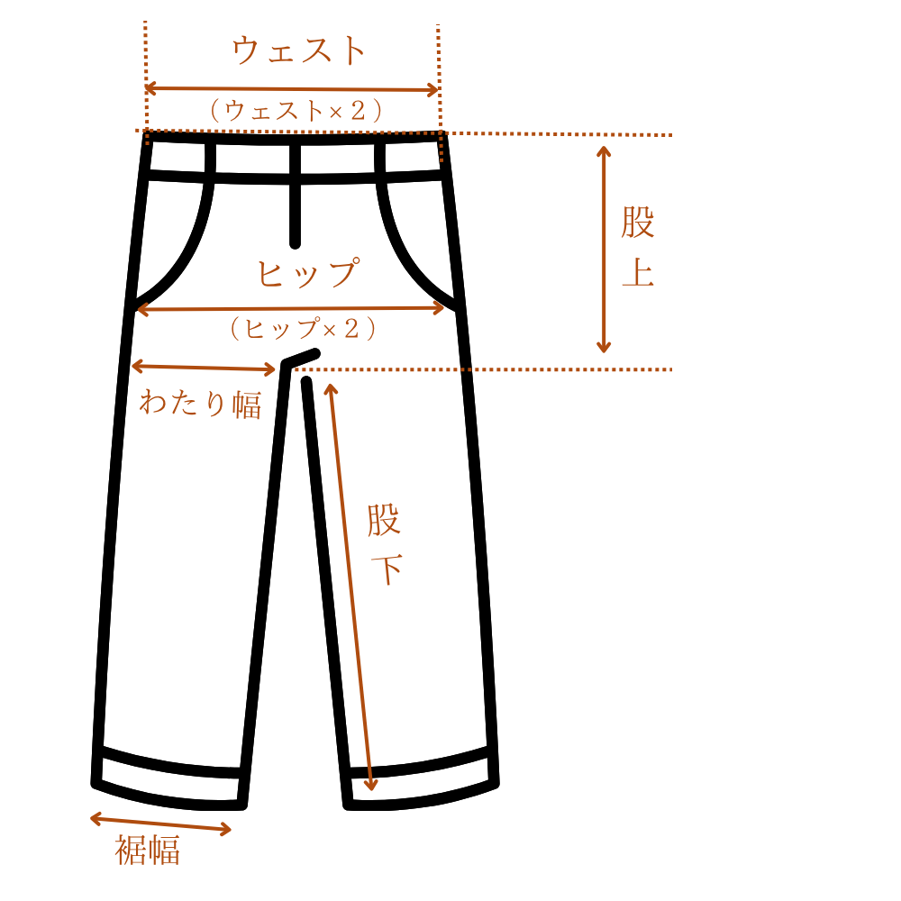 ウエスト:パンツの上部、端から端までを直線で測り、その長さを2倍した数値です。