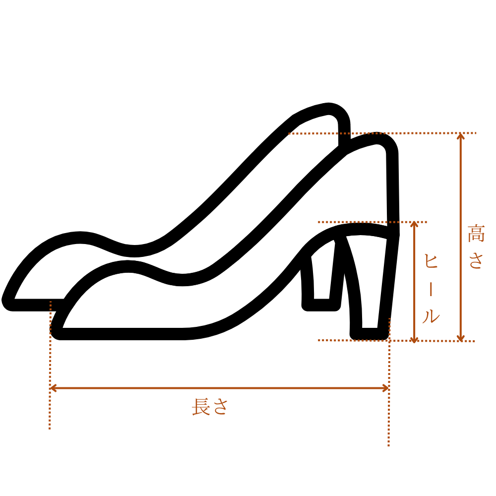 ヒール高(ヒール付きの場合):ヒールの上端から底までを垂直に測った高さです。
