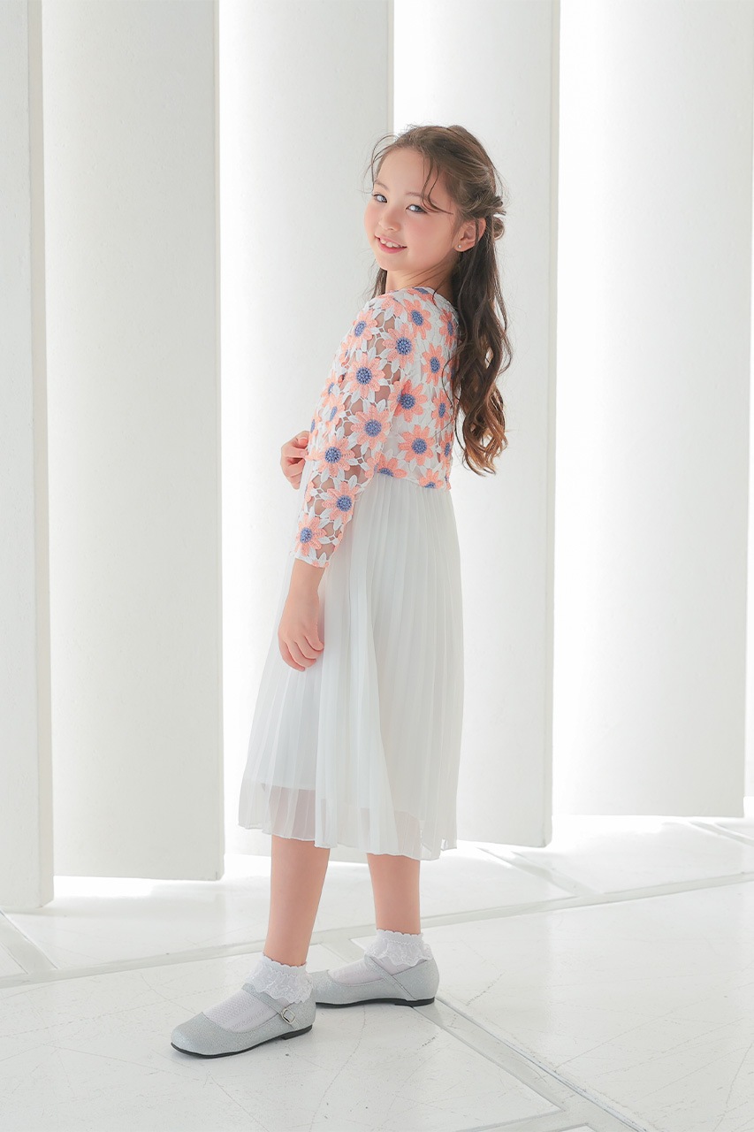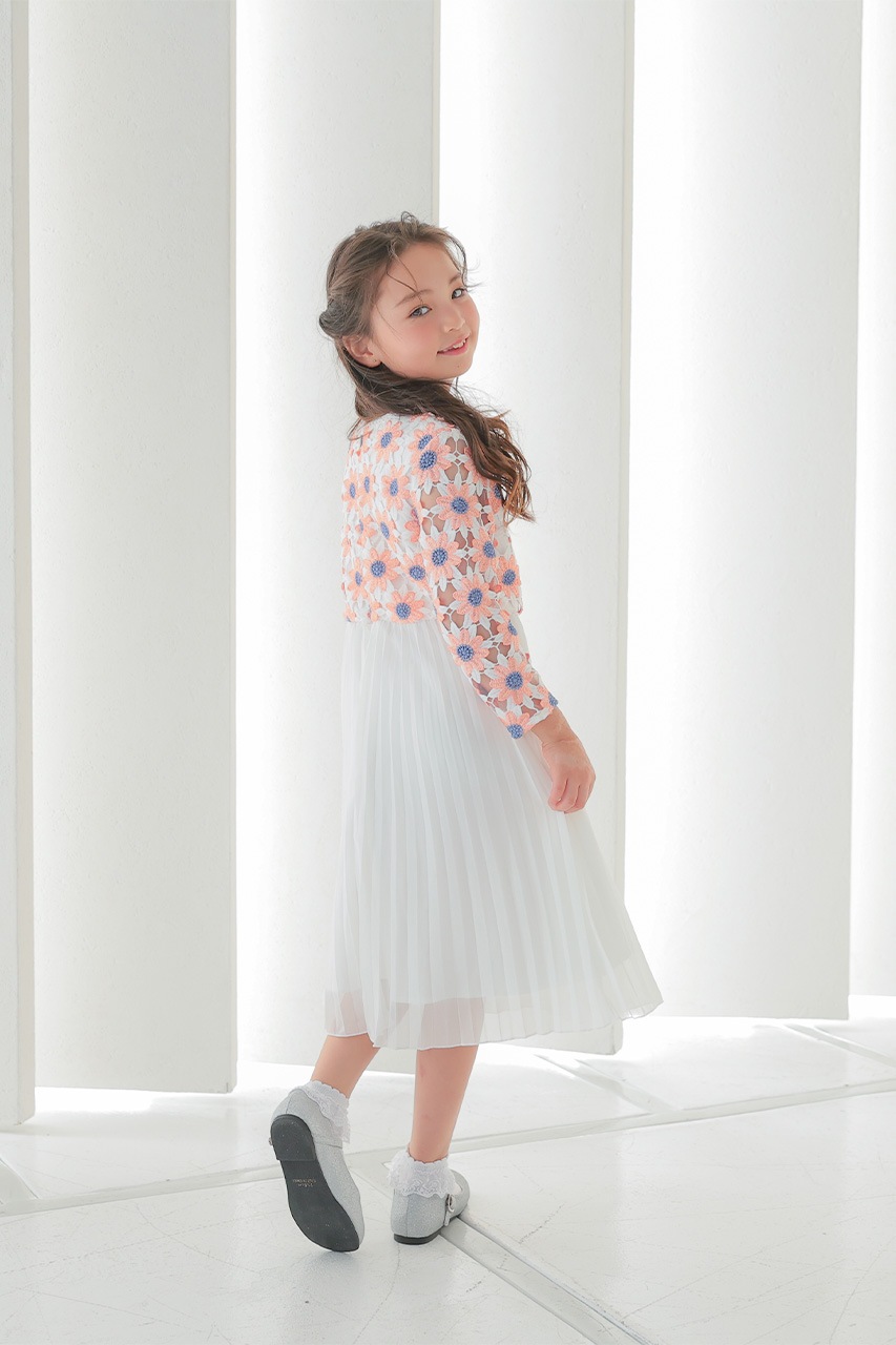 上身頃は高級感と耐久性に優れたクロシェレースを使用。 華やかなお花柄のデザインが目を惹き、他にはないデザイン性がキュートなドレスです。 スカートはプリーツデザインで、シフォン素材を使用しているので足さばきが軽やかで動きやすいのも嬉しいポイント。 ツルっとした肌触りのサテン生地を裏地として使用しているため、小さなお子様にもストレスなくお召しいただけます。 袖は裏地がなく透け感があるので重くならず、しっかりしたレースなので引っ掛けにも安心です。 清楚な雰囲気を演出するドレスは、結婚式のリングガールやフラワーガールなどの演出にはもちろん、フォーマルシーンにもおすすめです。